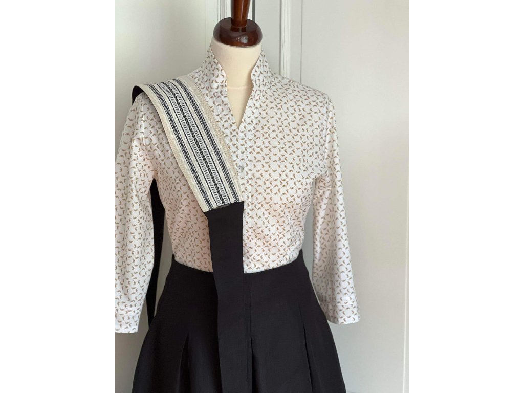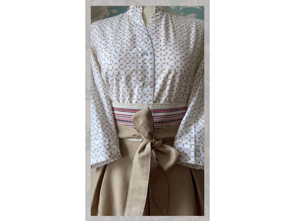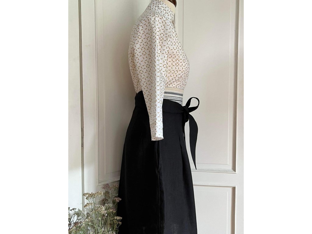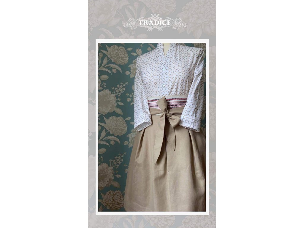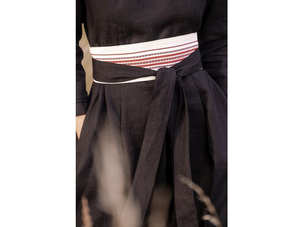 The front part of the wrap belt is decorated with a fabric called činovať. Crafted by Mrs. Buchtelová, a master craftsman, titled Bearer of Folk Craft Traditions. The belt has a hole in the side for stretching, so it lies neatly wrapped around the entire circumference. Basic material 100% linen.