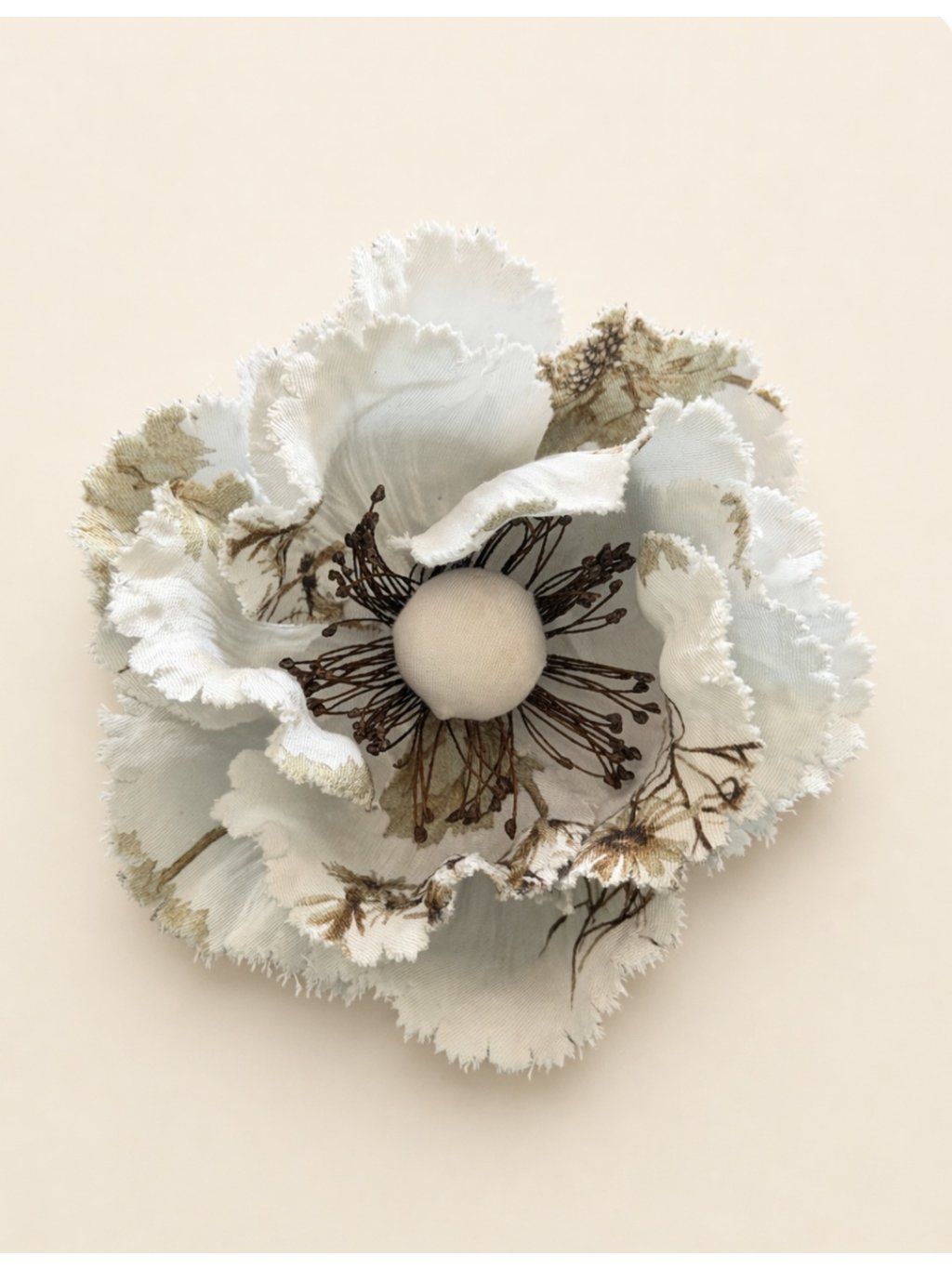 Látková květina je vyrobená ze 100% bavlny s autorským vzorem. Na zadní straně má kovový zapínací špendlík. Průměr květu je přibližně 10 cm. Vyberte si vzor a barvu. Květiny pro nás vyrábí Moraviaflor, tradiční výrobce papírových a látkových květin. Dílna je Nositelem tradic lidového řemesla.
