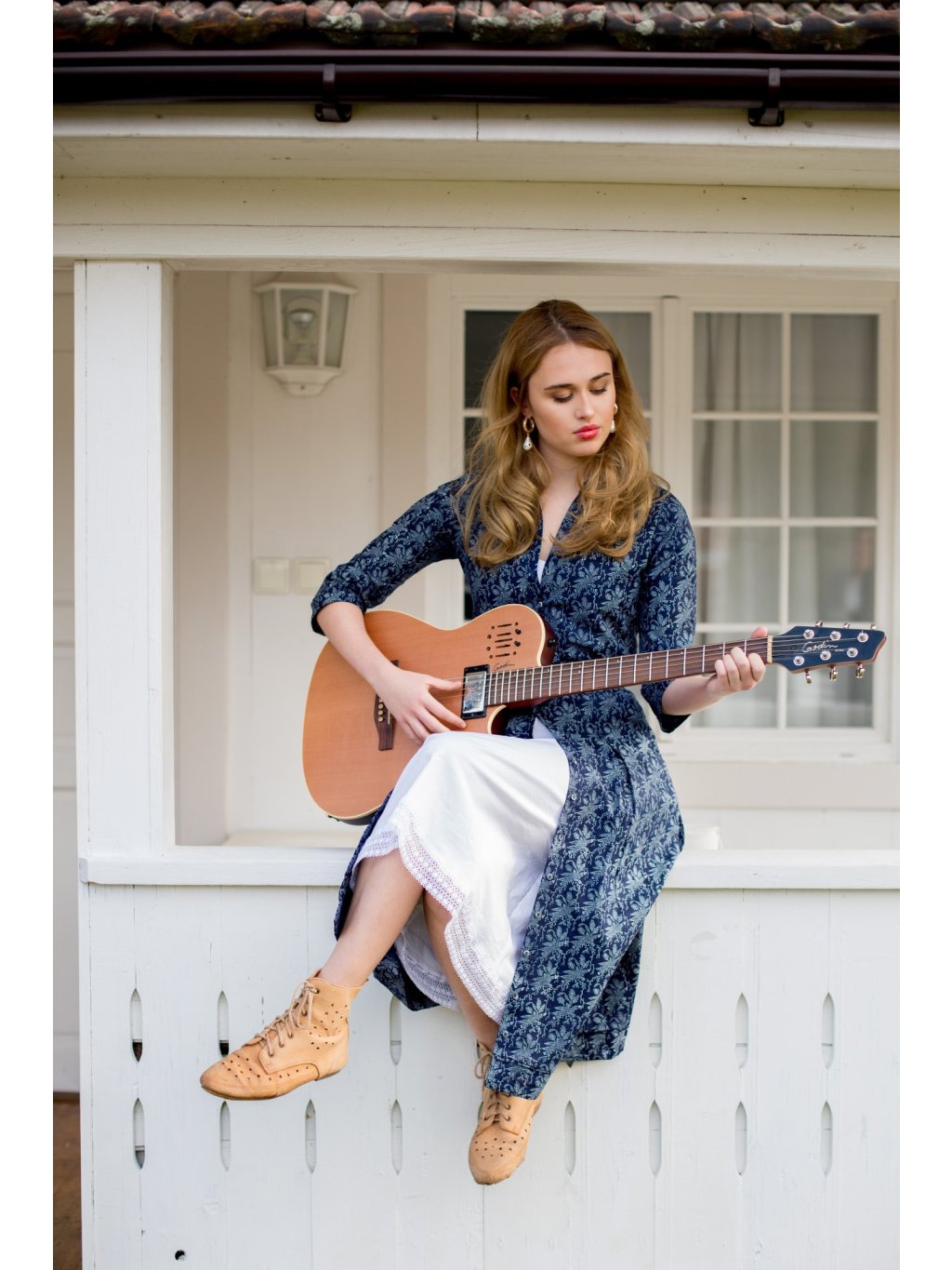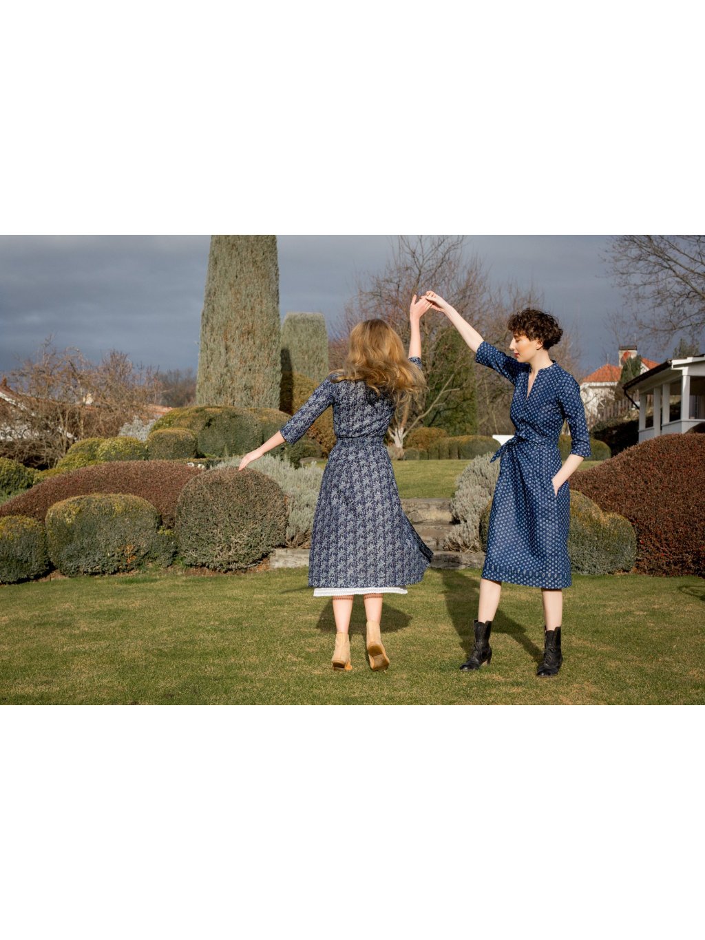 Košilové šaty se zavinovacím páskem mají stojáček, 3/4 délku rukávu, rukáv a sukni lemují sámky. Zapínání na perleťové knoflíčky. V bočních švech jsou prima kapsy. Šaty můžete krásně kombinovat se spodničkou do pasu, nebo košilkou midi, v bílé nebo navy barvě.