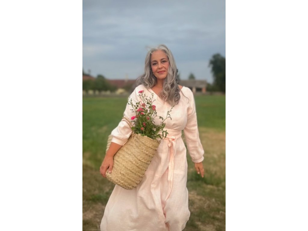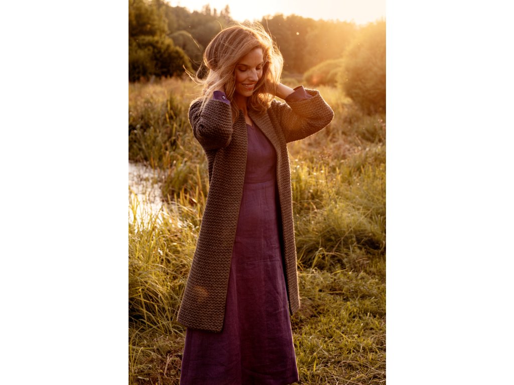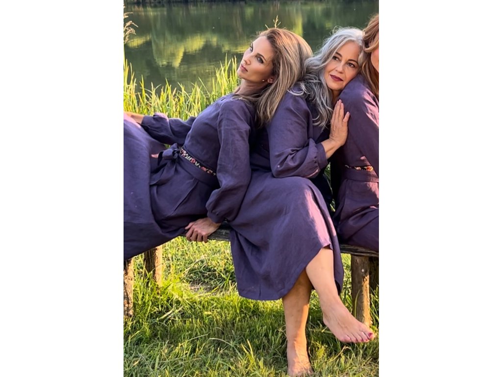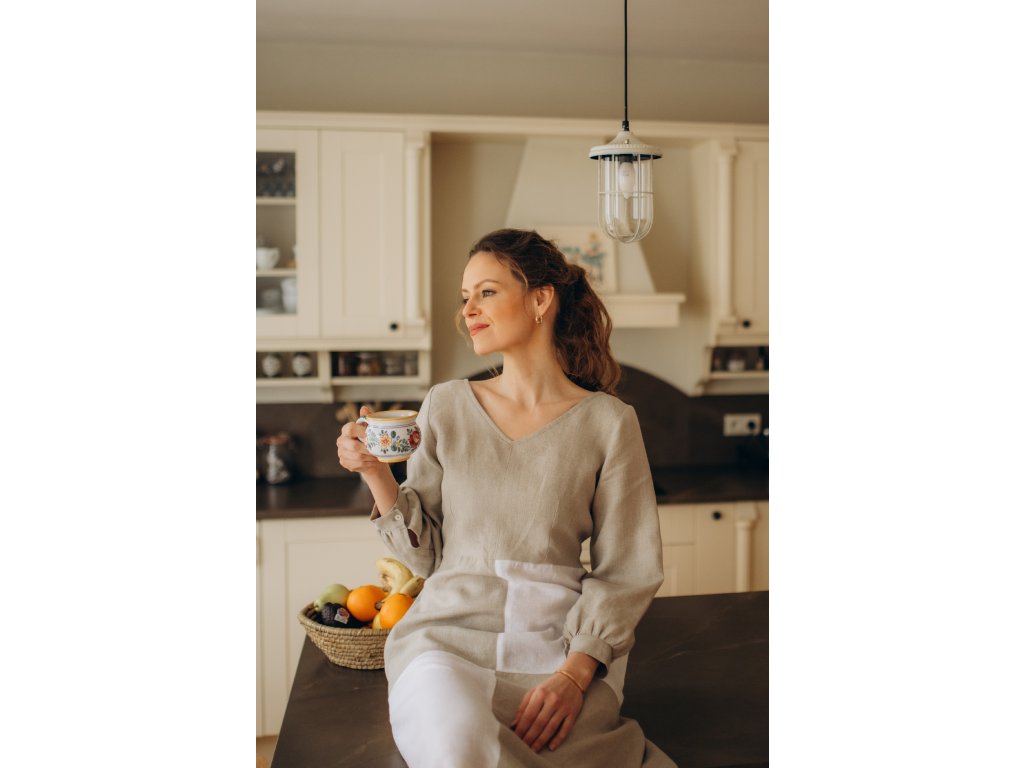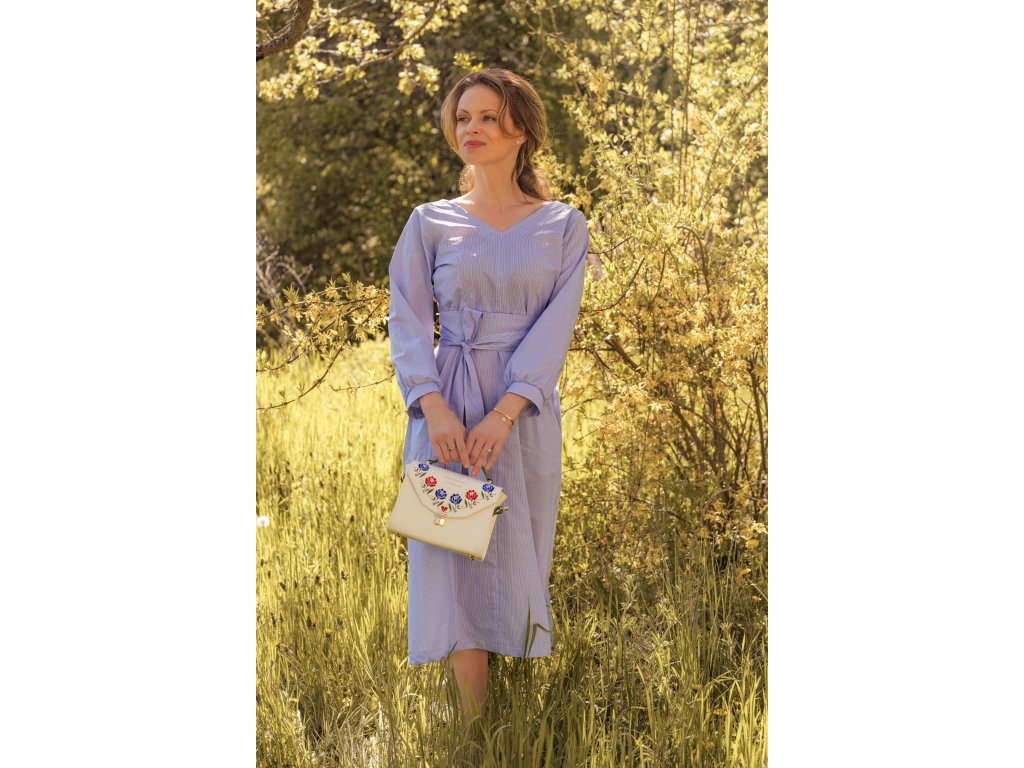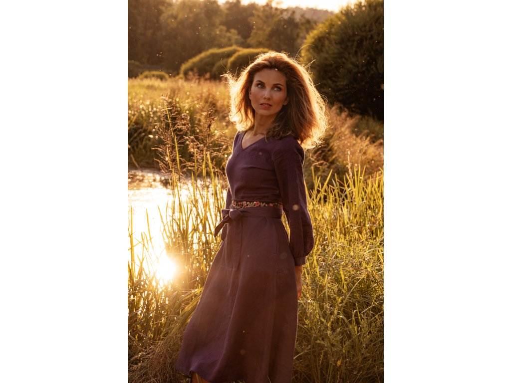 U jednobarevné varianty LEN ŠEŘÍKOVÝ je pásek zdobený vyšívanou stuhou.