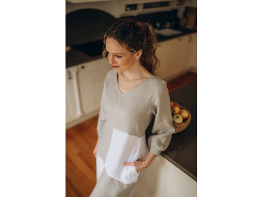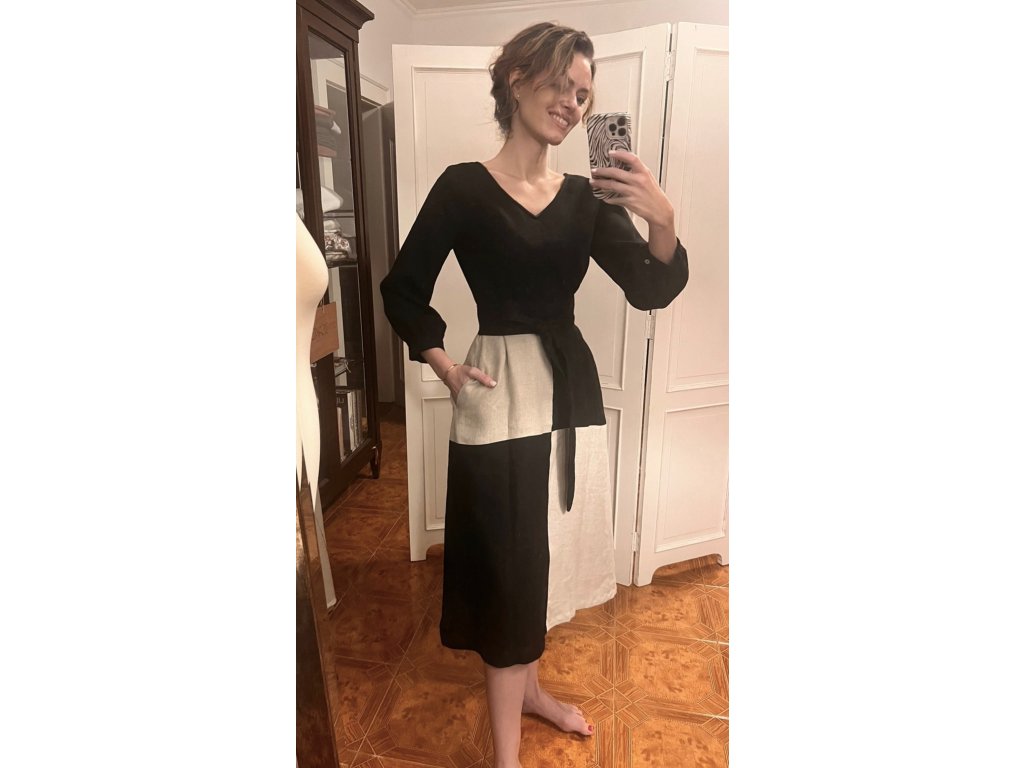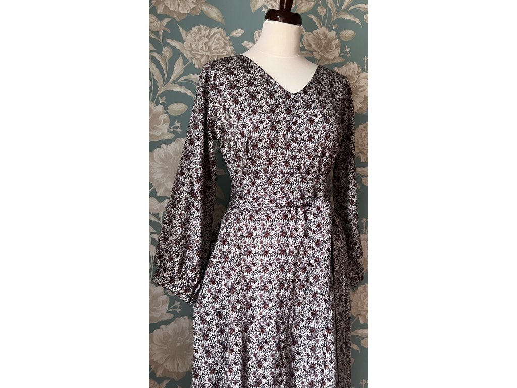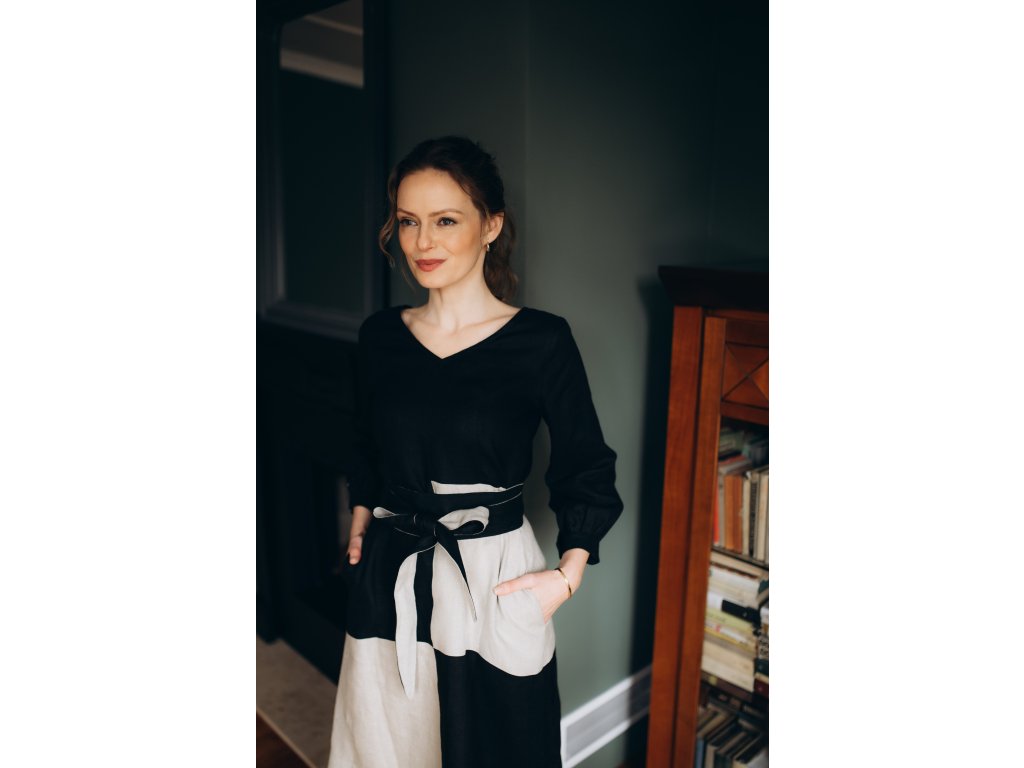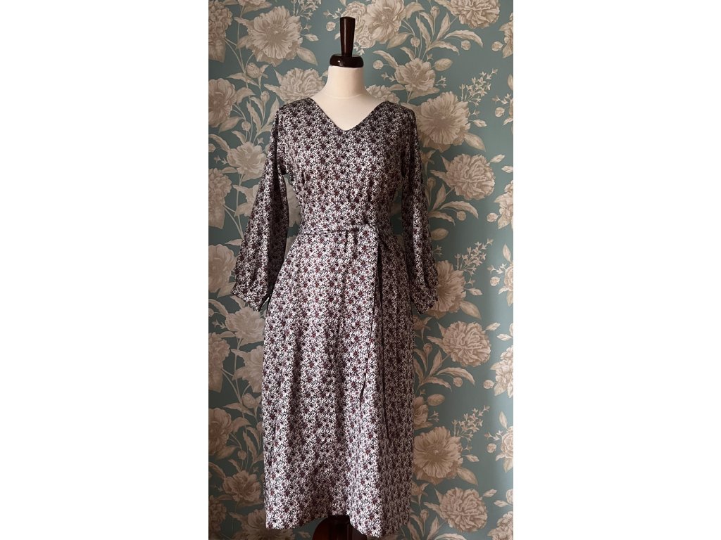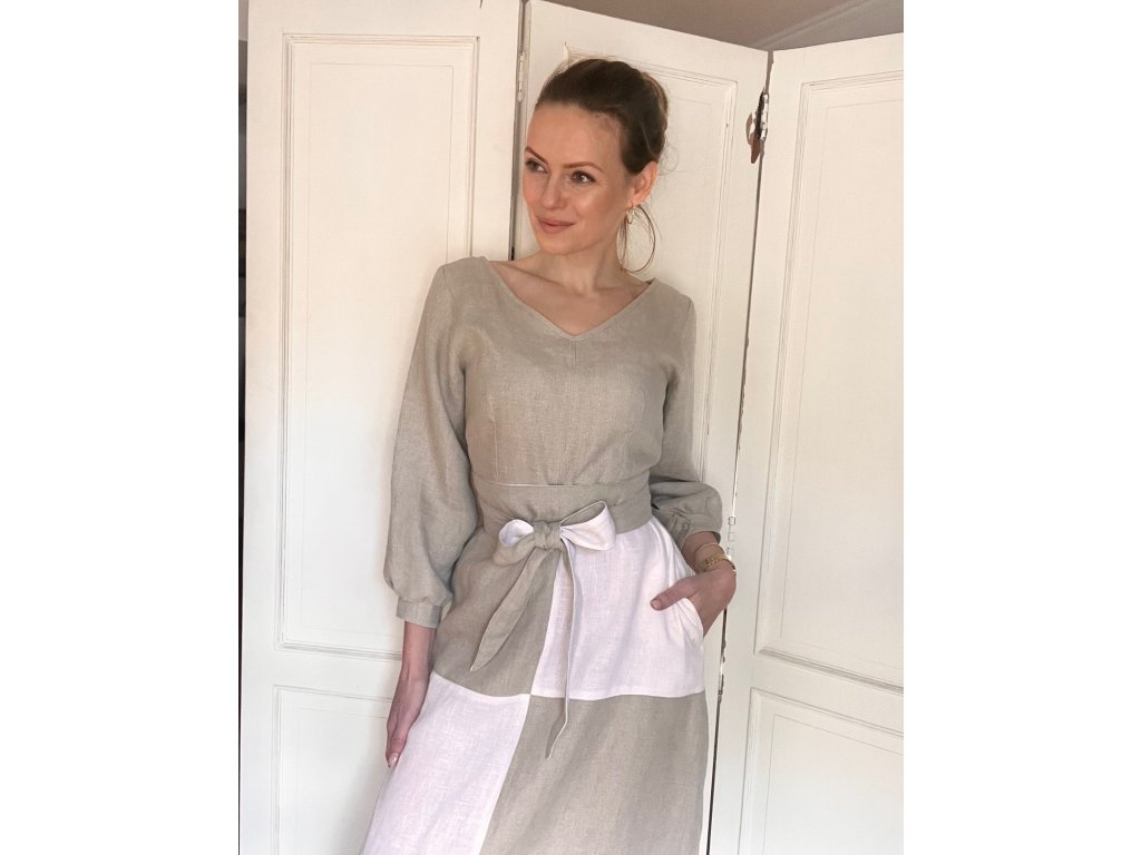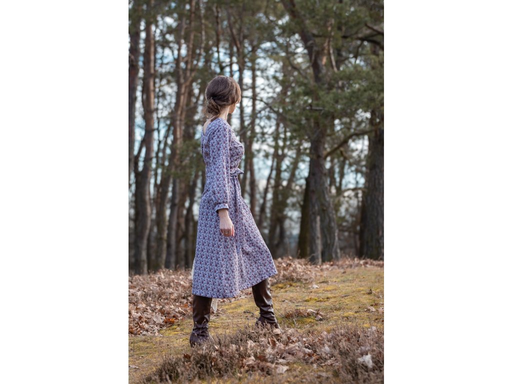 Šaty mají výstřih jemně do V ve předu i v zadu. Zapínání na zadním díle ve středu na zip. Rukávy se nabírají do manžety na perleťový knoflíček. V bočním švu kapsy. Délka nenavazuje na naše jiné produkty, ale můžete si na zakázku požádat o jakoukoli délku. Součástí je zavinovací pásek pro zvýraznění siluety. Šijeme jak z jednoho vzoru či barvy, tak kombinovaně. Požadovanou kombinaci nám napište do poznámky, nebo neváhejte napsat či zavolat a domluvíme se, možností je opravdu mnoho. Tento střih krásně funguje jak z pevnějších pružných manžestrů nebo měkkých pružných sametů pro chladnější období, tak ze všech lehkých letních materiálů.