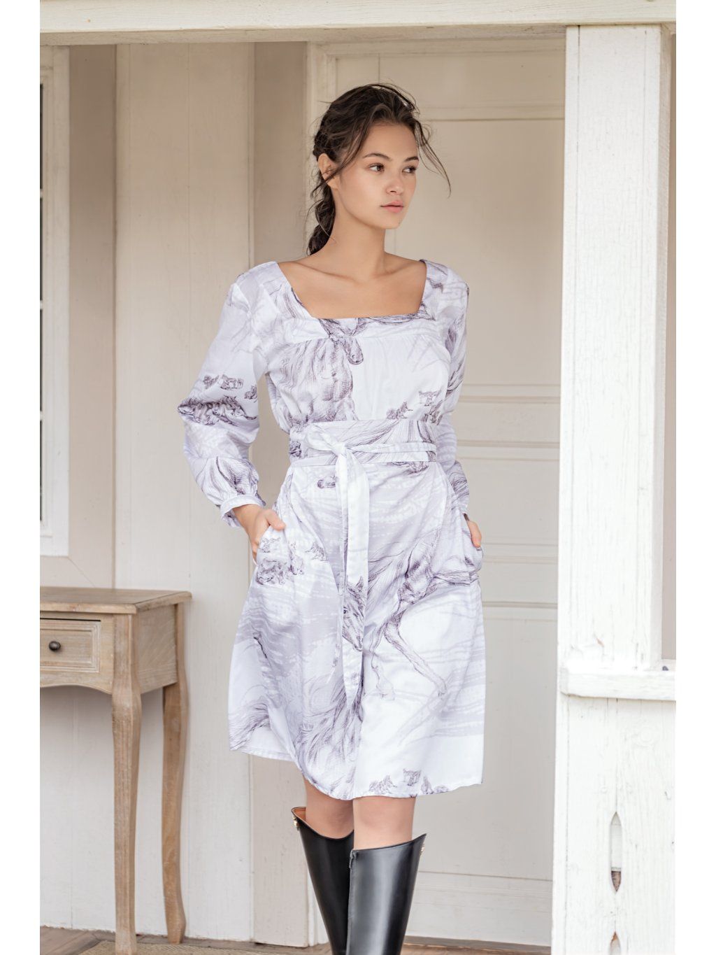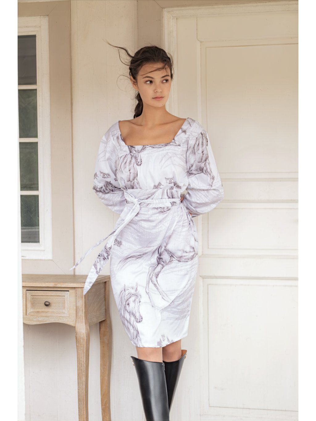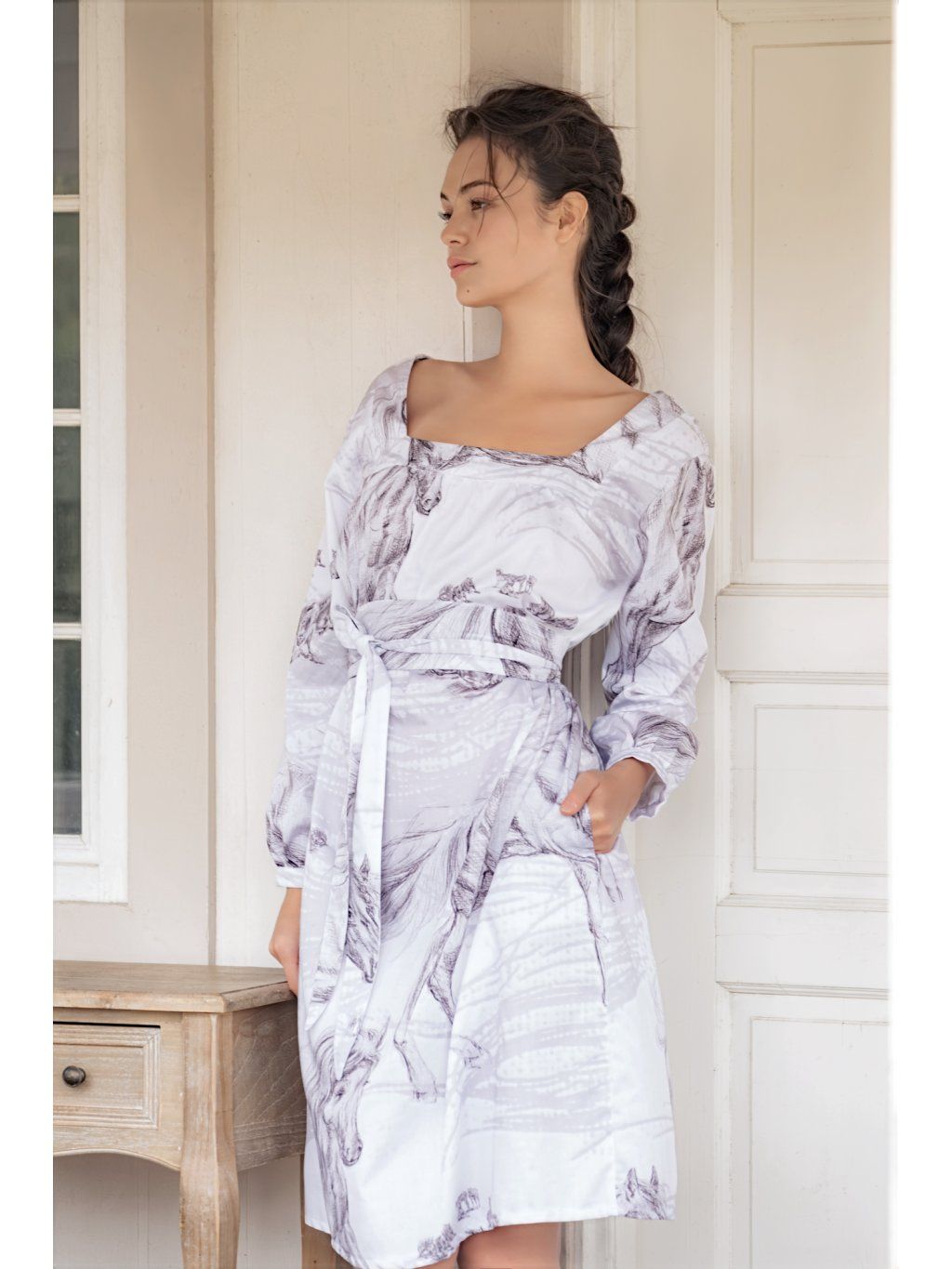Šaty volného střihu s prima kapsami v bočním švu. Dekolt hranatého tvaru je umístěný z přední i zadní strany. kapsy mají pohodlný rukáv hodinové délky, všitý do paspulky. Oblékají se přes hlavu. Momentálně šijeme z 100% bavlny ve struktuře drobounké vafle, v lila odstínu. Napsat si můžete do poznámky o odstín zelenkavý. Anebo si z nabídky vyberte vzor Koně pro symbol tohoto roku.