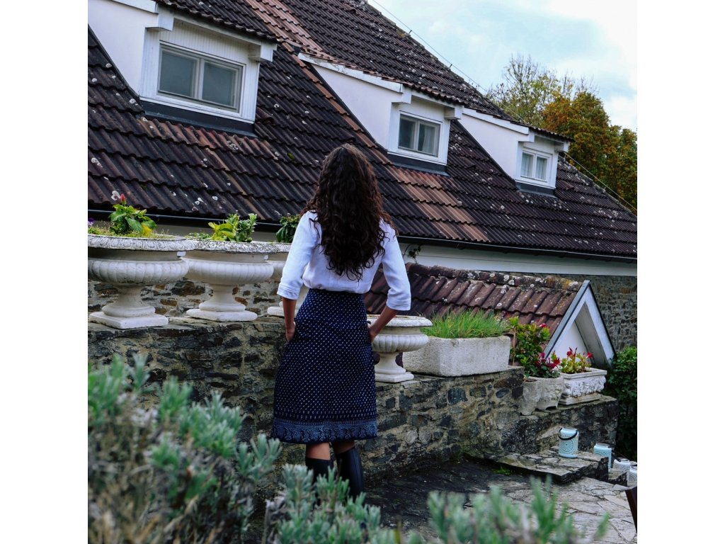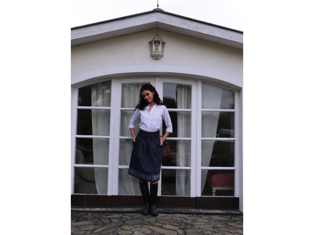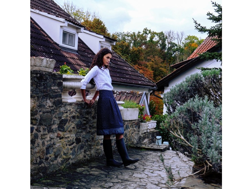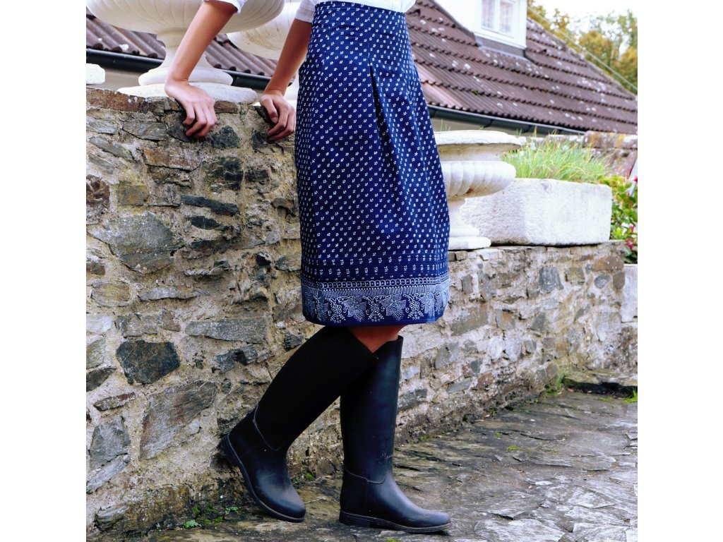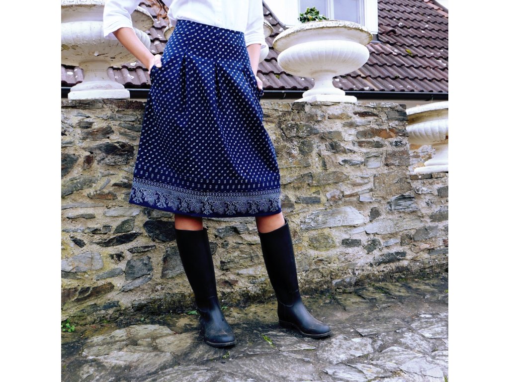 Sukně v délce po kolena navazuje na košilky a spodničky stejné délky. Sukně má vysoký pas, lehce se rozevírající, slušivou, linii, dvě prima kapsy a zapínání na zip. Dolní okraj lemují sámky. Modrotisk bavlna 100%. první 2-3 praní v ruce, dál pračka s tmavým prádlem. Rozdíl v délkách po kolena a midi je 10 cm.