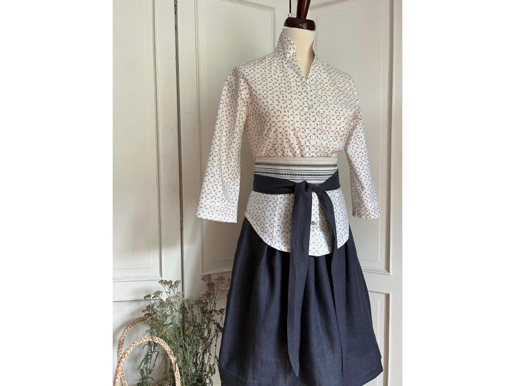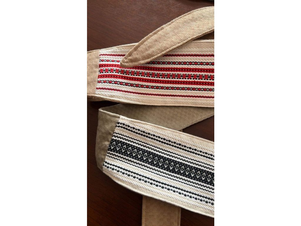 Zavinovací pásek zdobí na přední části tkanina zvaná činovať. Řemeslně zpracovala paní Buchtelová, mistr řemesla, mistryně tradiční rukodělné výroby, titulovaná Nositelka tradic lidového řemesla. Pásek má ve straně otvor na protažení, leží tak úhledně zavinutý po celém obvodu. Základní materiál je kvalitní len v přírodním odstínu. Ze stejného lnu u nás můžete objednat sukni a s páskem ji kombinovat.